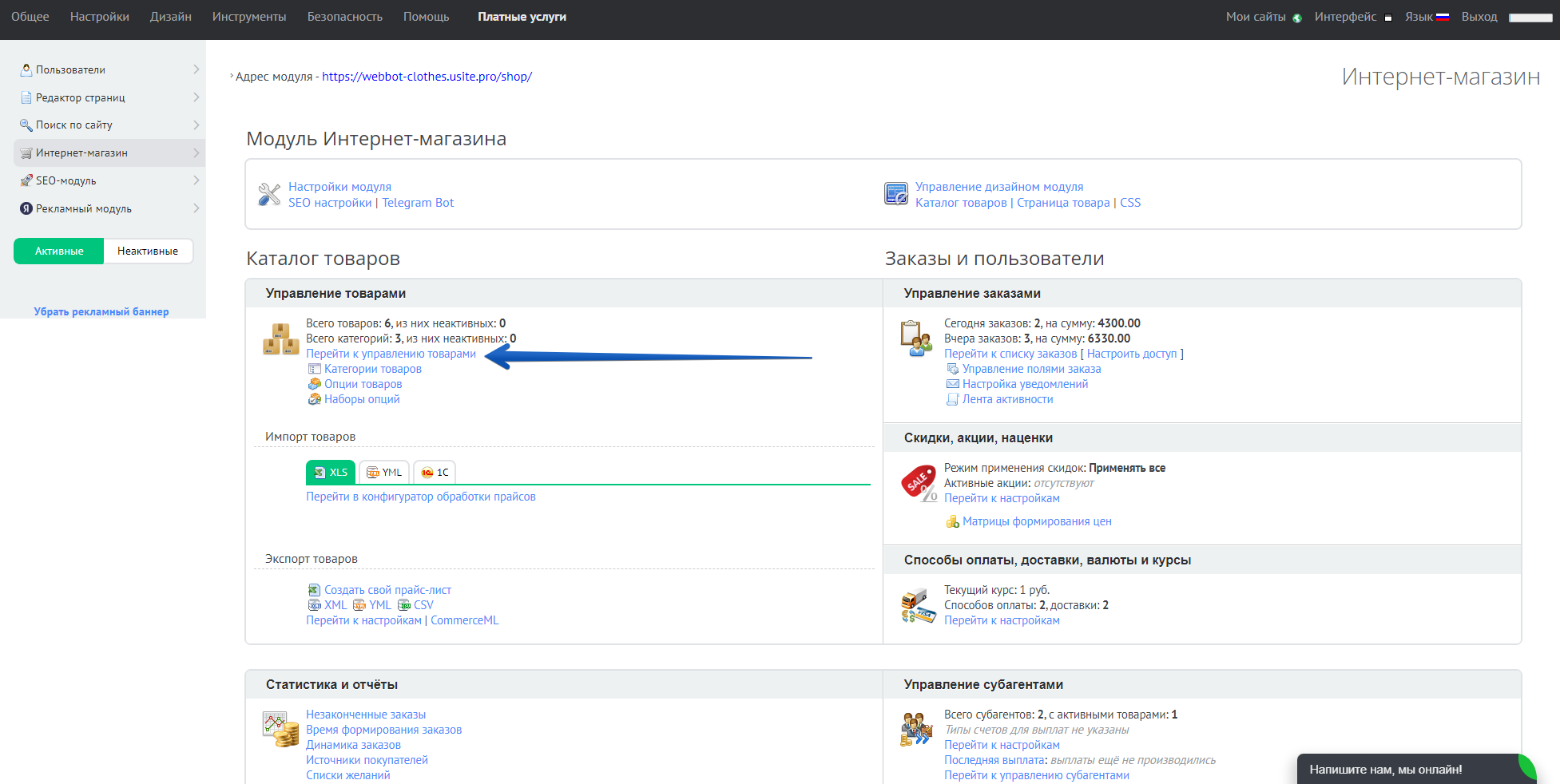 1. Чтобы сформировать ссылку на конкретный товар, мы должны сначала ID этого товара, для этого заходим в панель управления сайта - модуль "Интернет-магазин" - раздел "Управление товарами":