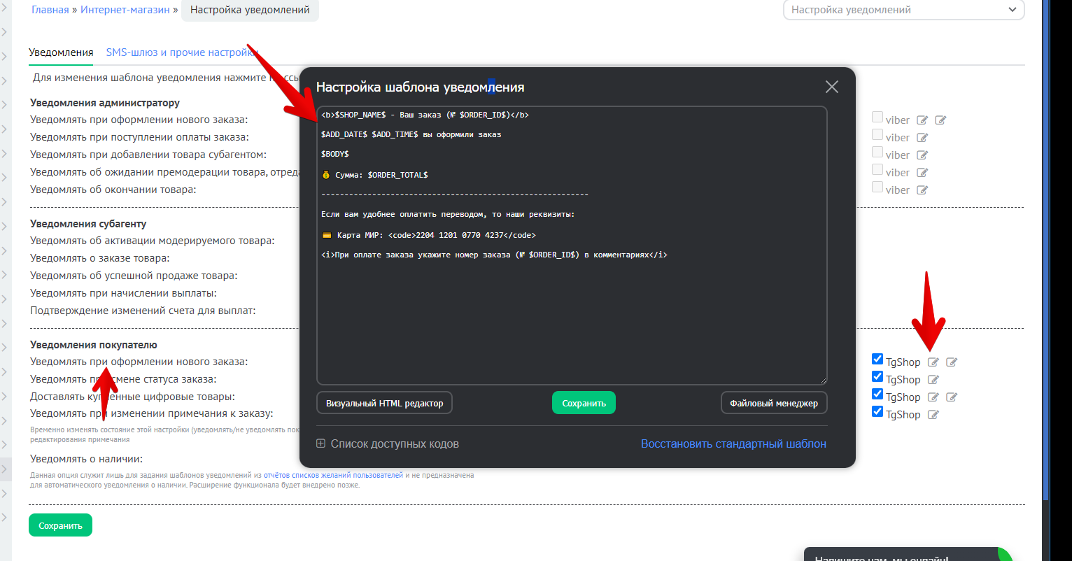 Чтобы добавить свои реквизиты в это сообщение, вам нужно зайти в раздел "Настройка уведомлений"