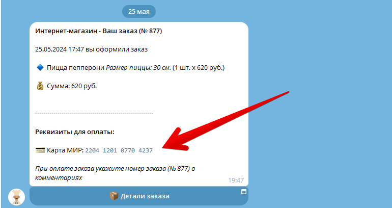 По стандарту после оформления заказа мы пользователю отправляем его заказ с кнопкой оплатить если подключена онлайн оплата, если онлайн оплаты нет, можно отправлять свои реквизиты карты для перевода, пример: