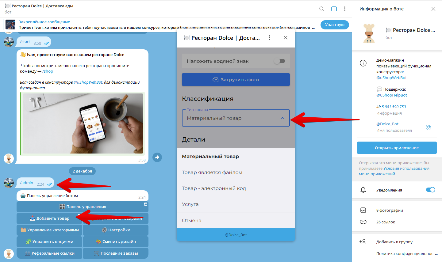 бота-каталога. Для организации такого магазина не требуется настраивать способы доставки, так как товар является файлом или кодом, то есть покупатель сможет скачать его после оплаты или получить уникальный код.