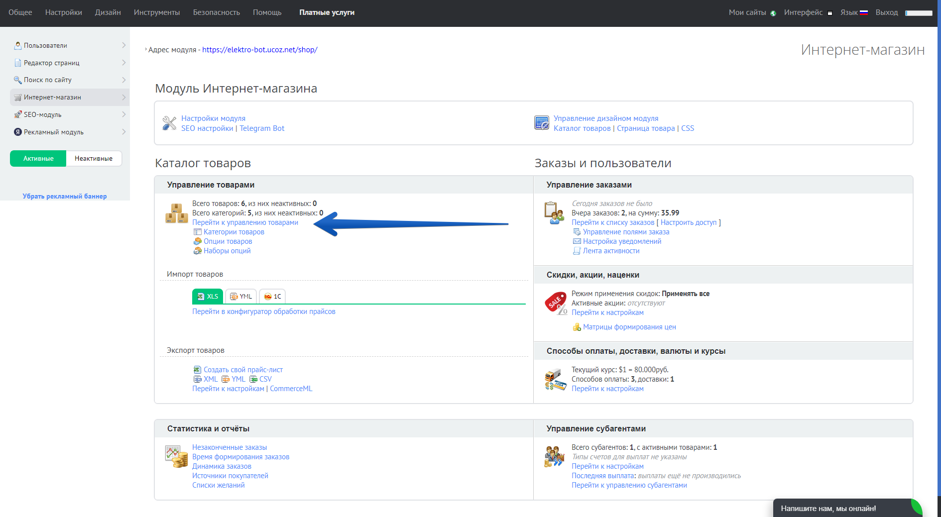 2. Как только мы создадим бота и подключим онлайн оплату, нам будет необходимо добавить товар, сделать это мы можем в модуле "Интернет-магазин", в разделе "Управление товарами":
