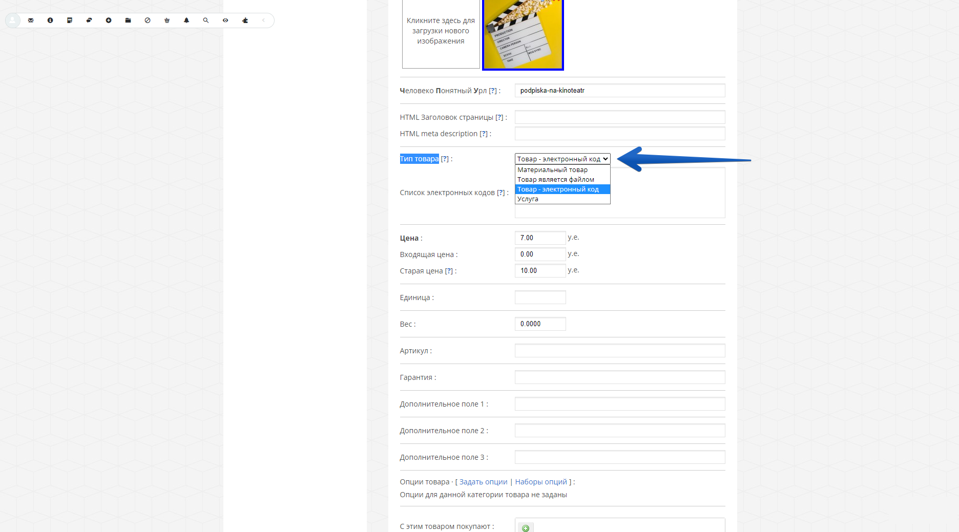 Так как мы планируем продавать электронные товары, то нам необходимо выбрать либо "Товар является файлом", либо "Товар электронный код".