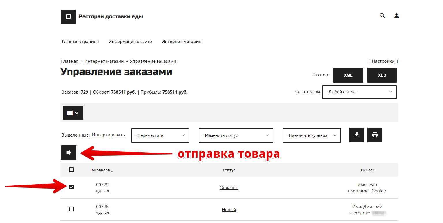 Если у вас не подключена онлайн оплата, то цифровой товар вы можете выдавать вручную через раздел "Управление заказами" (зайти в этот раздел вы можете при помощи команды /admin в вашем боте и выбрать вкладку "🛒 Последние заказы"). Вам нужно будет выбрать какой заказ вы хотите отправить и нажать на кнопку "Отправить", предварительно изменив статус товара на "Оплачен" вручную: